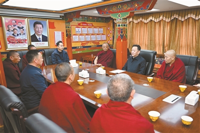 4月11日,自治区党委常委、拉萨市委书记达娃次仁调研全市宗教工作。这是达娃次仁在大昭寺,看望慰问寺庙僧人、公安民警、消防指战员、寺管会干部,与宗教界代表人士交流,了解“三个意识”教育、加强和创新寺庙管理、文物保护等...