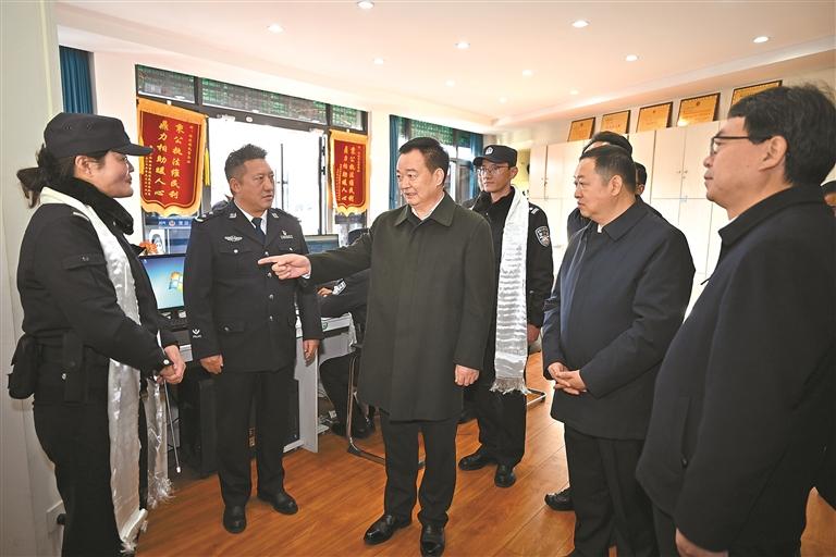 2月12日,自治区党委书记王君正在拉萨市看望慰问奋战在一线的基层政法干警、消防指战员、寺管会干部,代表自治区党委向大家致以新春祝福。这是王君正在明珠便民警务站看望慰问基层民警并了解相关工作。