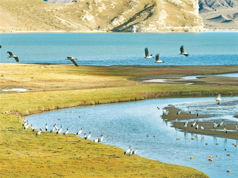 图为春堆乡卡东村黑颈鹤在空中飞翔。(本版图片由林周融媒、卡孜乡提供)