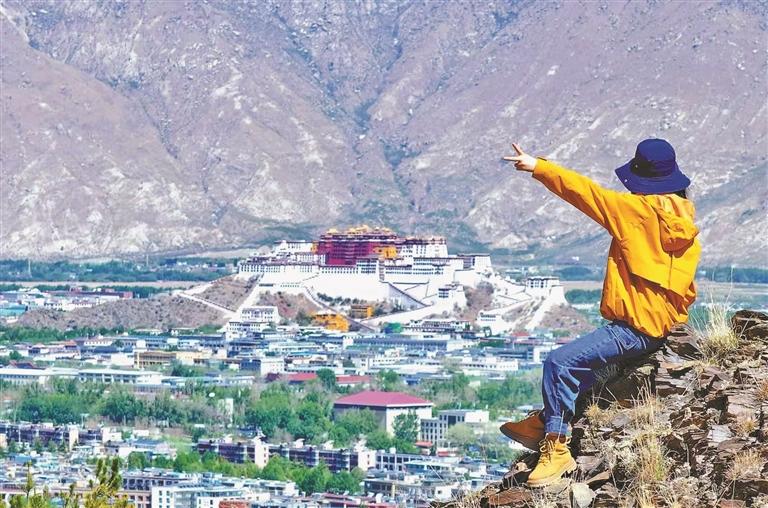 游客以布达拉宫为背景参与创意旅拍。本报记者 郑常容 摄