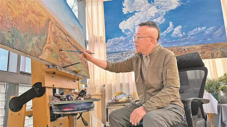 “我开始理解了,原来阴影不是简单的灰色,里面藏着蓝、紫甚至绿;阳光下的暖色,需要冷色的阴影来衬托才能跳出来。”他指着画作《草原新景》中雪山的背光面,“你看这里,我用了群青和玫红去调,这样才能表现出雪山的冰冷和空气的透明感。这在两年前,我是完全无法理解的。”
