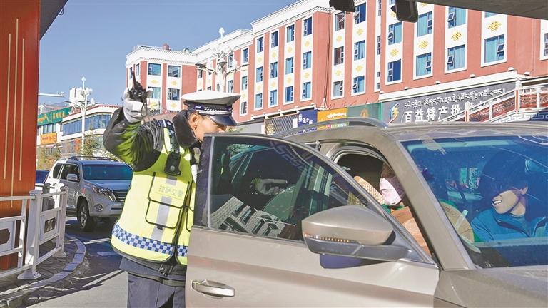 图为拉萨交警引导驾驶人将车辆驶至指定停车泊位中。本报记者 鹿丽娟 摄