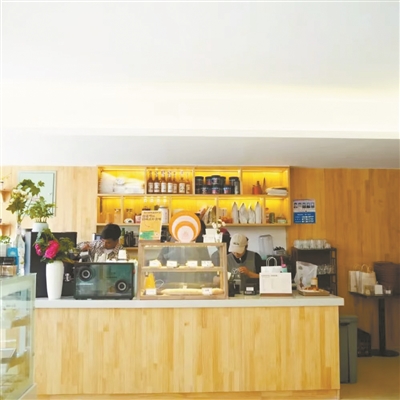 图为在慈松塘社区新型公共文化空间内,本地大学生在创业品牌“一棵一粒”咖啡馆内为群众提供服务。