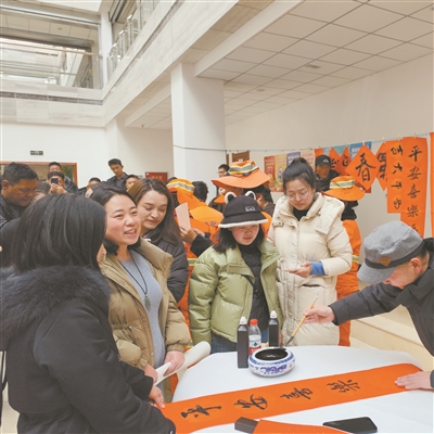 活动现场欢声笑语不断,城关区环卫工人、快递员及职工们一边欣赏书法创作,一边挑选心仪的春联和“福”字。火红的对联与“福”字映照着张张笑脸,承载着对新年吉祥如意的美好憧憬,也为冬日的高原增添了温暖的色彩。