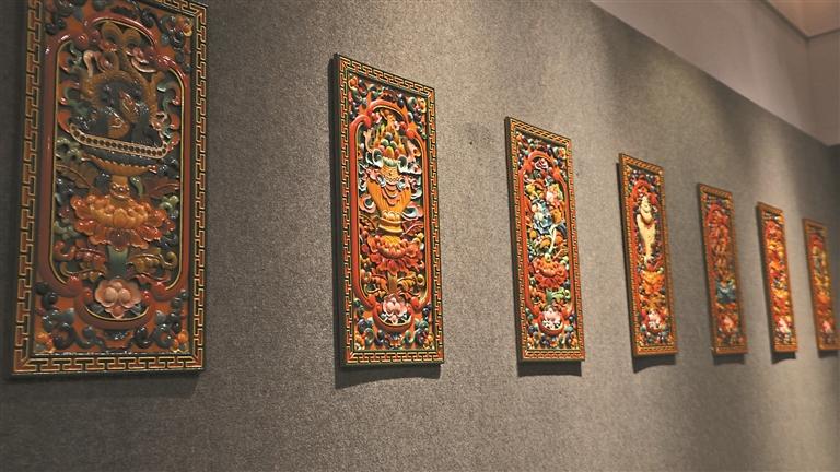 2024年,市民参观“雪域彩韵——藏式木雕彩绘精粹展”暨西藏职业技术学院50周年校庆教学成果展。