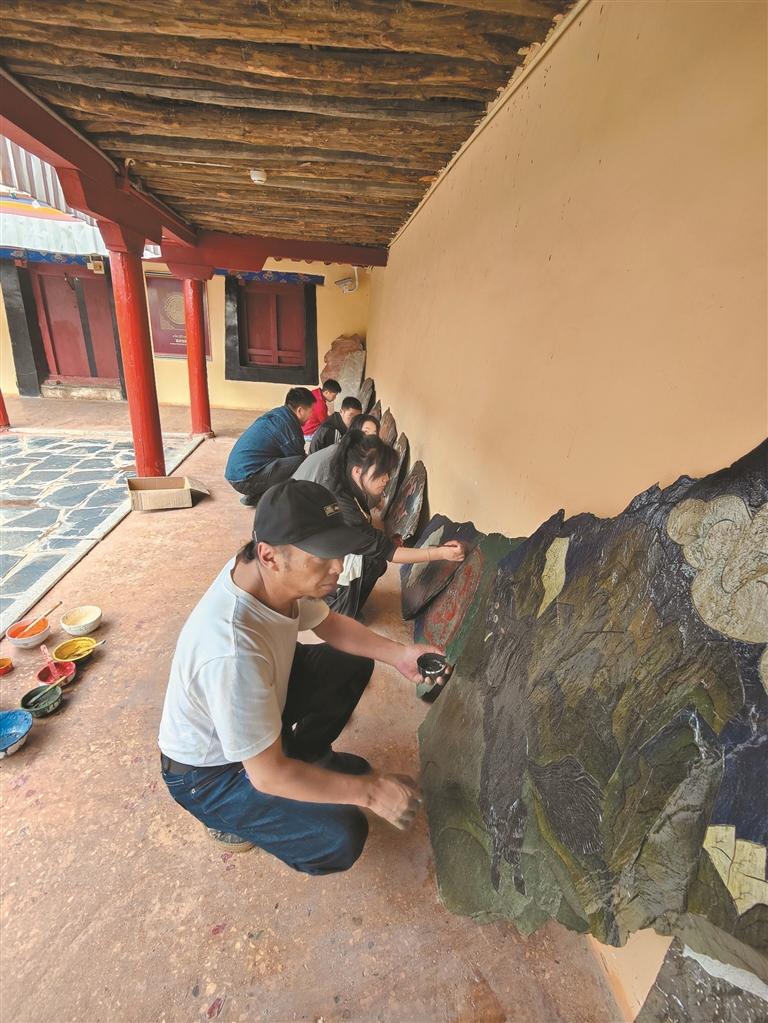 为了提升教学实用性,加措牵头编写《常用藏式彩绘教程》。编写期间,他带领学生赴布达拉宫研究壁画色彩保存技巧,到萨迦寺记录梁枋传统纹样,走遍西藏古建筑遗址,将老工匠口传心授的技艺要点转化为教材中的文字与图示。加措认为:“以往老工匠传授手艺依赖观摩模仿,易出现偏差,教材的编写能让学生进行系统学习,确保手艺传承不走样。”如今,该教材已成为西藏职业院校藏式彩绘专业的核心教材,同时被多地民间工坊用作培训资料。
