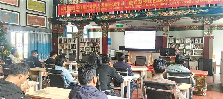 加措在“藏式彩绘技艺助力乡村振兴技能研修班”中为学员讲解传统藏式木雕和彩绘技艺。本报记者 格桑伦珠 摄