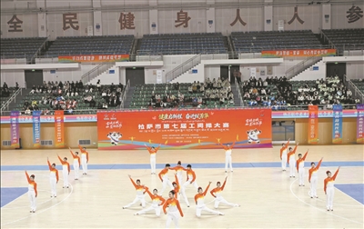 图为城关区代表队在赛场上展现工间操的独特魅力。拉萨融媒记者 巴桑次仁摄