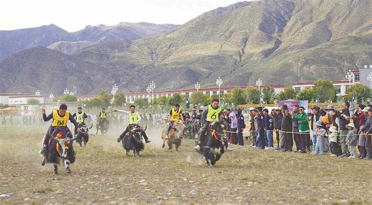 10月1日,拉萨市墨竹工卡县赛牛场举办独具特色的牦牛竞速赛,为游客和群众呈现了一场力量与速度的较量。
