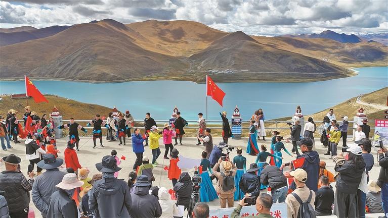 图为在羊卓雍错,游客和当地群众跳起欢快的锅庄。本报记者 武沛涛 摄