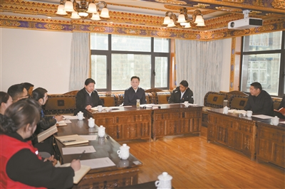 四月十六日上午,自治区党委常委、拉萨市委书记达娃次仁深入八廓古城调研党建引领基层治理工作。这是达娃次仁在吉崩岗街道听取基层治理工作开展情况汇报,与基层干部座谈交流。拉萨融媒记者 崔 成摄