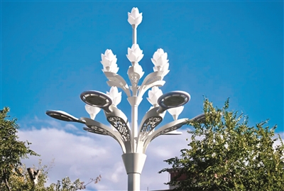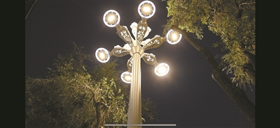 “路灯造型挺独特的,像美丽绽放的雪莲花,而且灯还可以变色,时而蓝色时而紫色,在保证照明度的前提下考虑到了造型的美观,让人眼前一亮。”过路市民周银学说。