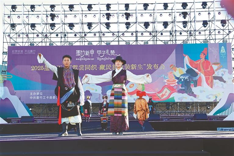 图为模特在2025墨竹工卡“霓裳同织·藏民族服装新生”发布会上展示墨竹服饰。