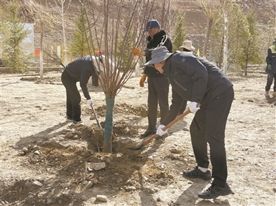 图为植树活动现场,大家一块挥锹铲土、扶苗定植。拉萨融媒记者 莫瑞英摄