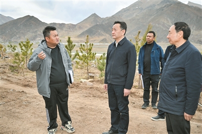 近日,自治区党委常委、拉萨市委书记达娃次仁调研南北山堆龙片区绿化工作。这是达娃次仁在马镇、德庆镇片区察看苗木生长状况,与现场工作人员交流,了解绿化规划、树种选择、水源保障等情况。拉萨融媒记者 崔 成摄