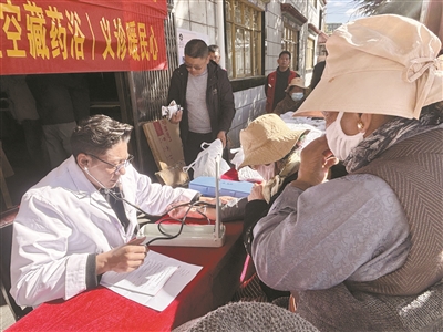 图为隆沐藏医诊所的医生为社区老年人量血压。 拉萨融媒记者 次仁卓嘎摄
