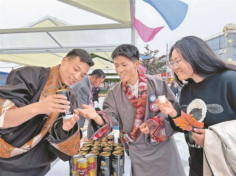 图为南京市民在净土产品展销摊位前品尝青稞酒。
