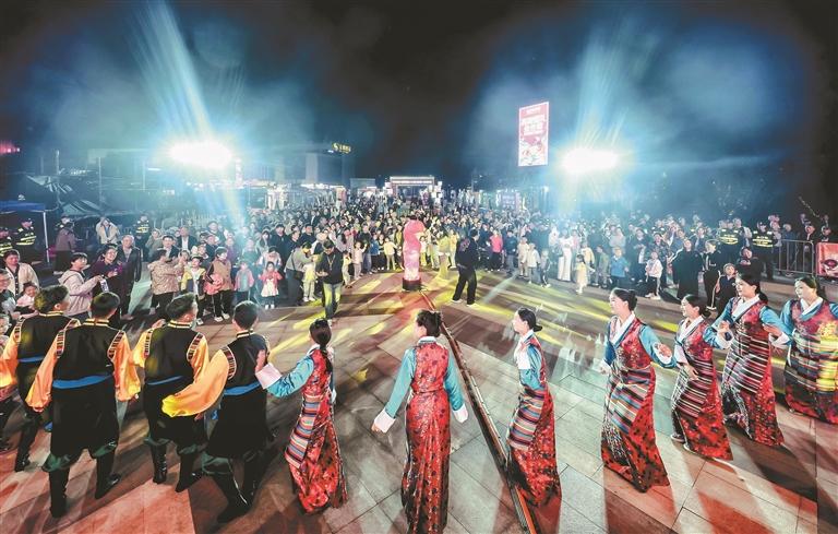 图为万人锅庄晚会现场,南京市民与墨竹工卡县松赞艺术团演职人员一起跳锅庄。