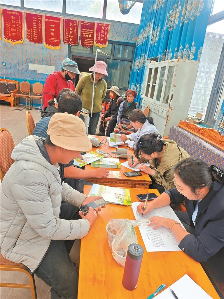 “五彩梅朵·曲水心桥”志愿服务队耐心为村民组长讲解政策。