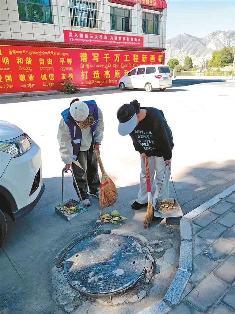 “邻里守望·阿佳行动”志愿者在打扫辖区卫生。