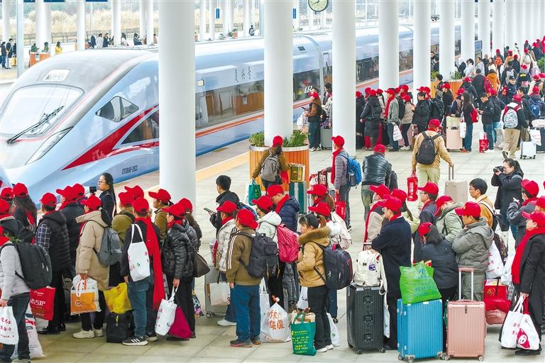 2025年2月5日,务工专列乘客在云南省广南县站登车(无人机照片)。新华社发(彭奕凯 摄)