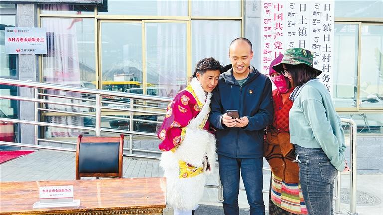 图为工行西藏分行驻村队员为当地村民介绍“兴农通”APP金融服务功能及使用方法。