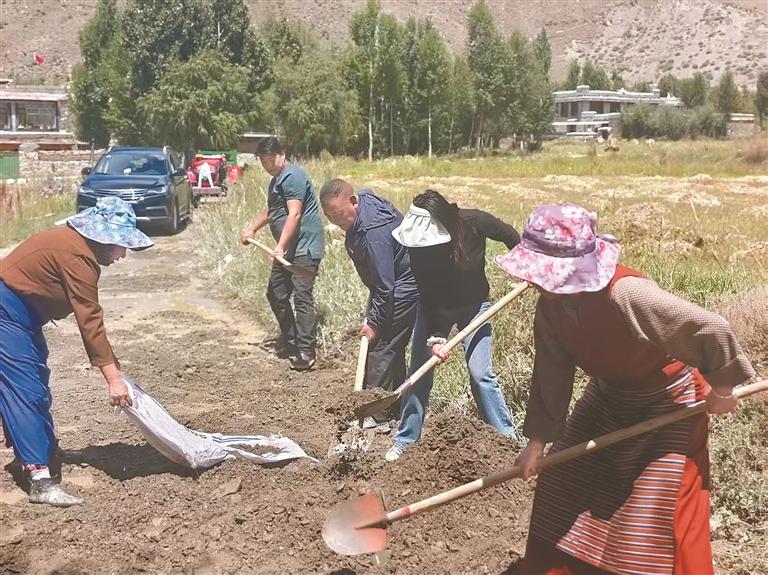 图为山南市商务局驻村工作队队员和村民一起修整田间道路,方便人员和车辆通行。