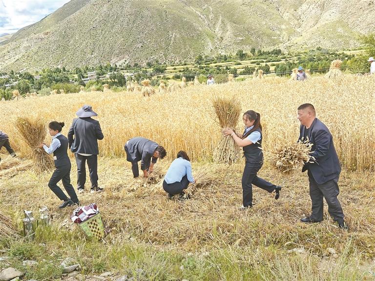 图为农行山南分行“格桑花”金融服务队队员帮助群众收割青稞。
