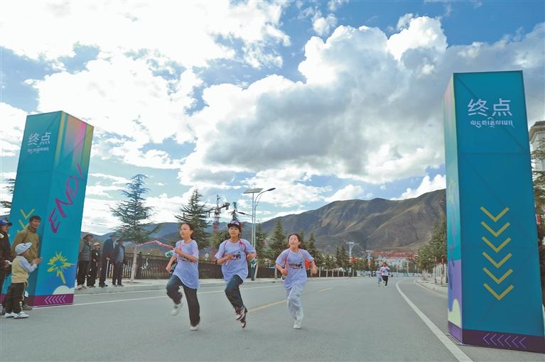 图为参加夜跑活动的学生冲过终点。本报记者 格桑伦珠 摄