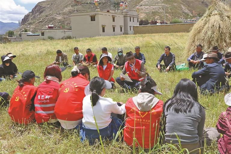 近日,全国劳动模范、城关区夺底街道维巴村党总支书记尼玛,走进田间地头,为夺底街道干部职工、维巴村(社区)工作人员,以及辖区党员、群众代表宣讲强农惠农政策。本报记者 卢文静 摄