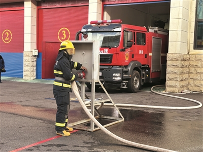 图为活动现场,队员协作开展“利用室内消火栓快速出水操”比赛。 拉萨融媒记者 拉姆次仁摄