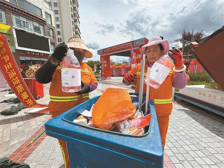 图为昌都市的环卫工人在进行垃圾分类。本报记者 白玛泽旺 摄