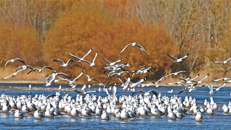 图为拉萨河畔嬉戏的候鸟。本报记者 唐斌 摄