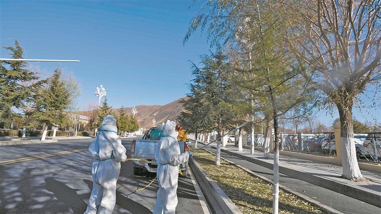 图为工作人员用高压喷雾设备对雪松全方位喷洒环保型药剂。本报记者 格桑伦珠 摄