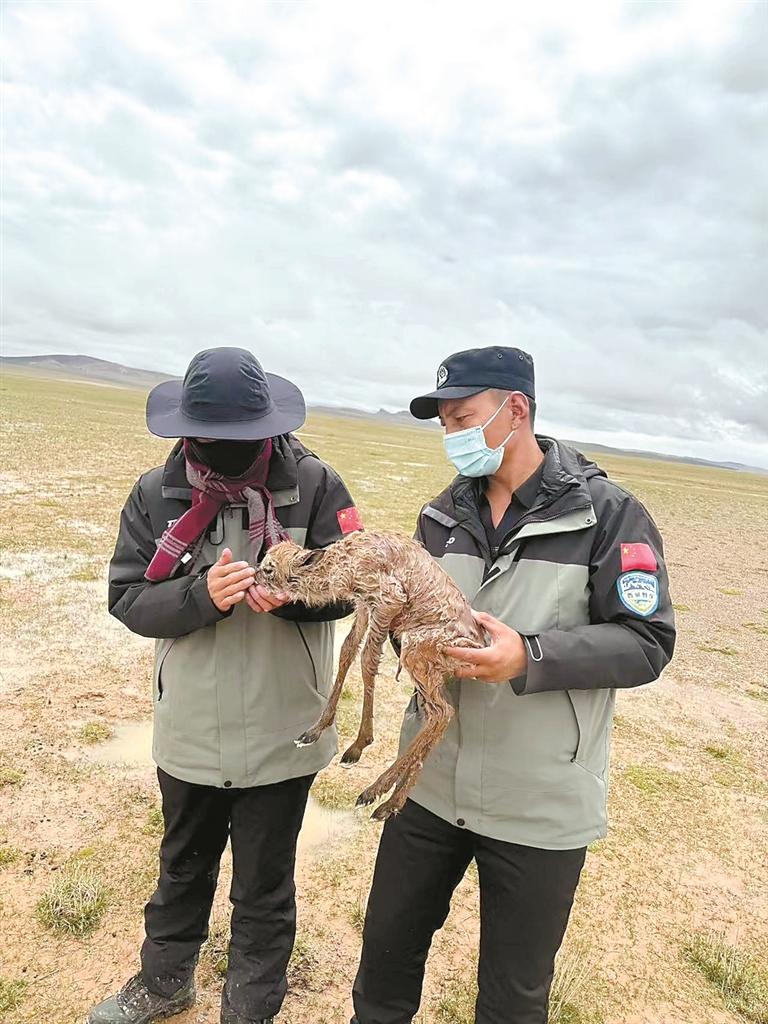 图为萨太尔管护站巡护员救助刚出生的藏羚羊。 平措益西提供