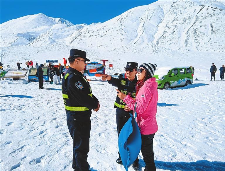 图为珠峰边境派出所民警为游客介绍景区相关情况。