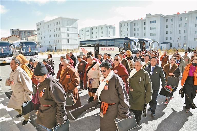 出席政协第二届那曲市委员会第五次会议的政协委员有序步入会场。