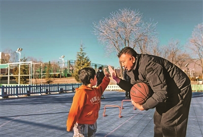 图为1月22日,在拉萨市全民健身体彩公园,“阳光残障儿童公益兴趣班”教师土旦格桑在体适能训练课程间隙与一名残障儿童击掌。
