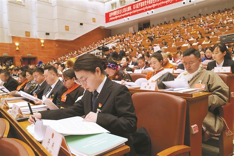 图为代表在认真聆听政府工作报告。 本报记者 丹增群培 摄