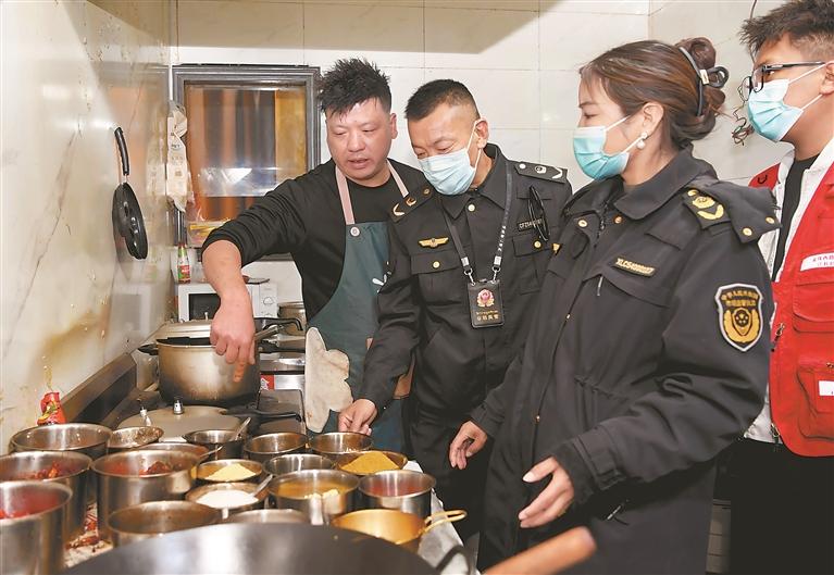 图为拉萨市城关区市场监督管理局金珠西路市场监督所执法人员对饭店后厨环境卫生进行检查。