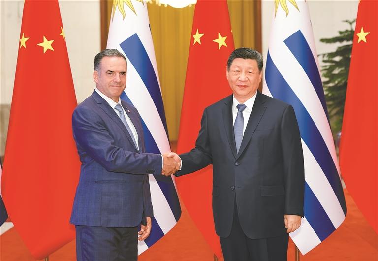 习近平指出,当今世界正处于百年未有之大变局,国际形势变乱交织,单边霸凌愈演愈烈,中方支持乌拉圭接任“77国集团和中国”轮值主席国,愿与乌方加强全球南方团结协作,共同推进平等有序的世界多极化、普惠包容的经济全球化,携手并进、共谋发展,为构建人类命运共同体作出更大贡献。