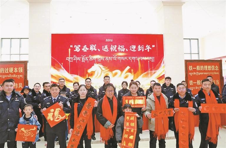 活动现场墨香四溢、暖意融融。由特邀的区、市书法名家及市公安局书画摄影协会成员组成的创作队伍,以汉藏双语书写春联和“福”字,吸引在场人员纷纷驻足领取。
