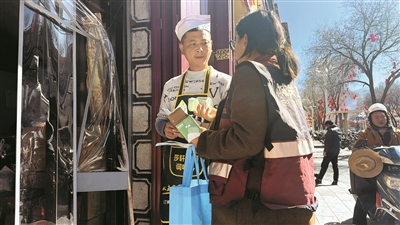 图为工作人员向沿街商户普及控烟知识。