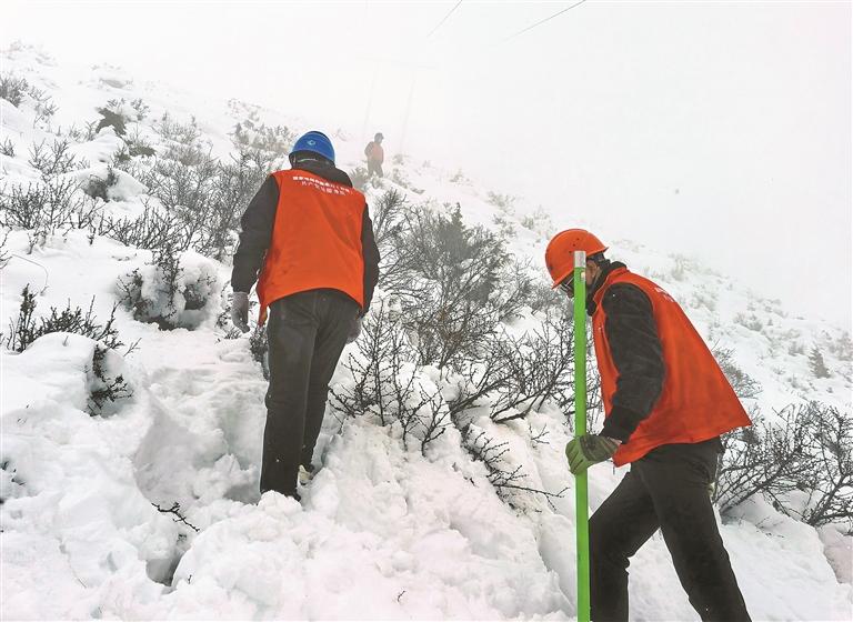 节日期间,昌都市左贡县普降大雪,为保障群众用电,国网左贡县供电公司供服中心工作人员对辖区内输电线路开展巡视工作,并利用无人机对覆冰线路进行空中巡查。