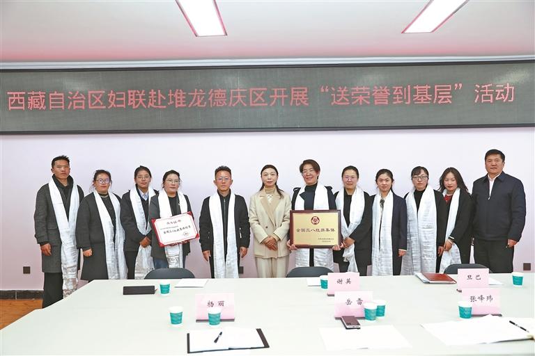 近日,自治区妇联赴堆龙德庆区开展“送荣誉到基层”活动,为荣获“全国三八红旗集体”的堆龙德庆区妇联授牌。活动现场,自治区妇联为获奖集体授牌、敬献哈达,还实地走访“小龙花”妇女儿童服务中心、“晓燕”工作室,了解阵地建设与运行情况。