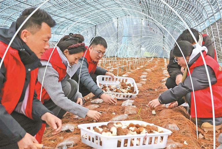 活动现场,身穿红马甲的志愿者们穿梭在菌垄之间,大家分工协作、井然有序,有的负责采摘,有的负责分拣装筐,有的负责搬运,一派忙碌而充实的景象。