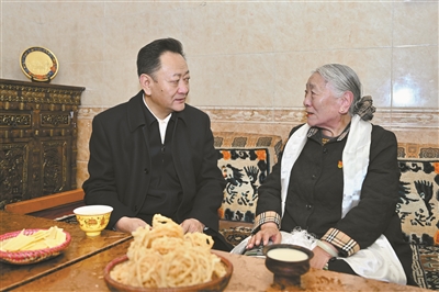 三月二十七日上午,自治区党委常委、拉萨市委书记达娃次仁看望慰问老干部。这是达娃次仁看望慰问卓玛仁增。 拉萨融媒记者 崔 成摄