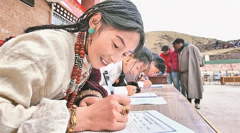 图为贡觉县莫洛镇阿卡村群众在进行书法比赛。本报记者 平措郎加 摄