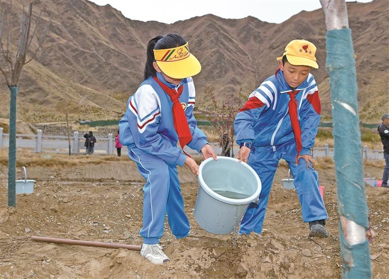 拉萨市第一小学学生在城关区慈觉林植树点参加春日植树活动。本报记者 潘多 洛桑 摄