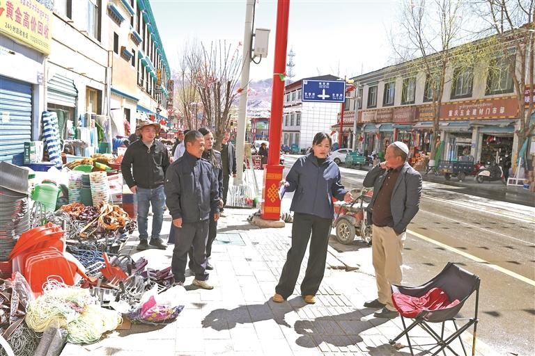 图为工作人员对县城主干道沿街商铺存在的乱堆乱放、占道经营等情况逐一记录并现场反馈。本报记者 丹增平措 摄